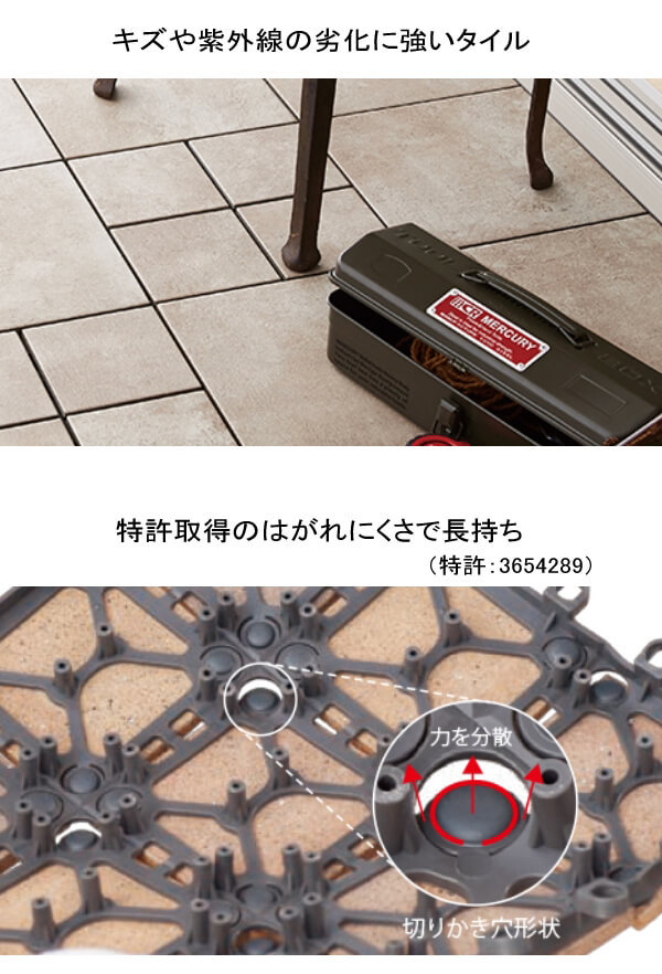 タイルと樹脂がはがれにくい安心の構造です。