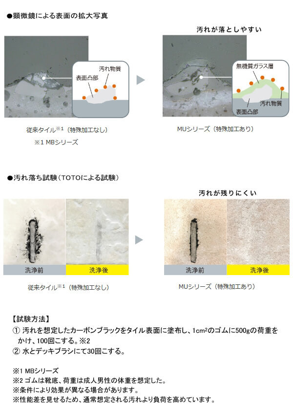 清掃性に優れたタイル表面にも、滑りにくくするために小さな凸部があります。MUシリーズの表面は、二層の無機質ガラス層で表面を覆う特殊構造を採用しているため、滑りにくさをキープしたまま、さらに汚れが落ちやすくなっています。