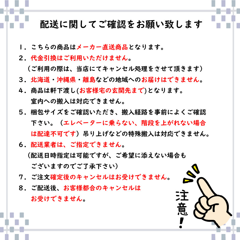 5.梱包サイズをご確認いただき、搬入経路を事前によくご確認下さい。(エレベーターに乗らない、階段を上がれない場合は配達不可です)吊り上げなどの特殊搬入は対応できません。