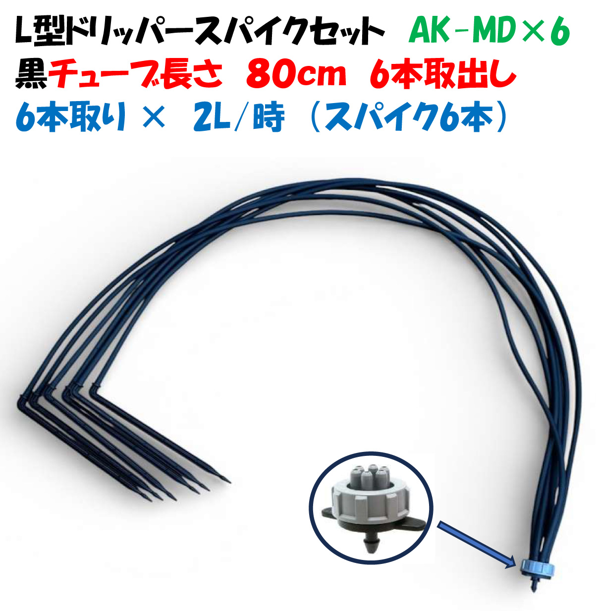 ブラックチューブ L型ドリッパーセット AK-MD×6 6分岐 2L/時 チューブ80cm 点滴かん水 ポット潅水 防藻 黒チューブ 点滴ノズル 多数の吐出口