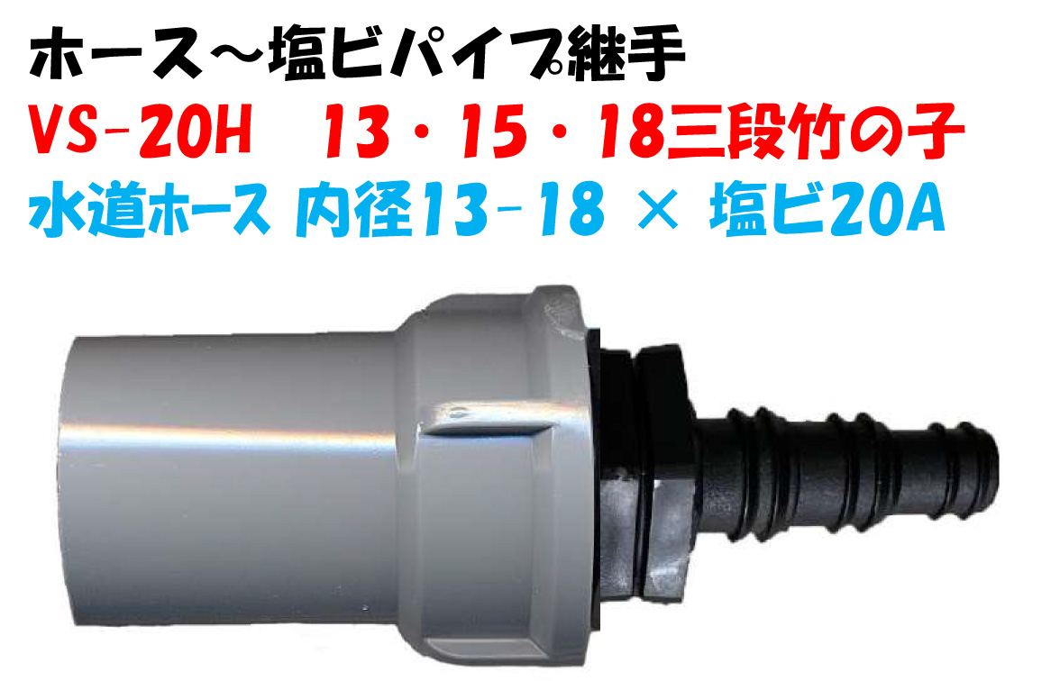 ホース継手 ホース〜塩ビパイプ VS-20H 13・15・18mm 三段竹の子 VP20A用