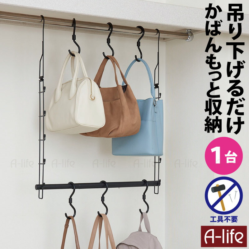| 商品説明 | クローゼットのハンガーパイプに引っ掛けるだけ! 吊り下げかばんハンガー 伸縮タイプ クローゼットで形やサイズの異なるバッグをフックに引っ掛けてスッキリ収納! スペースを有効活用します。 もっと出し入れスムーズに収納したい鞄を、掛けて収納できます。 回転フックは、1台に6個付いています。 360°回転するフックなので、かばんの向きを調整できます。 掛けて収納することで、いろいろなサイズや形のかばんもスッキリ収納。 上側と下側の2段に収納できるので、省スペースでたっぷり収納できます。 水平バーは高さ5段階調節できるので、かばんのサイズにあわせて合わせて設置できます。 幅は6段階で調節可能な伸縮式で、収納にあわせて調節できます。 プッシュピンで調節なので、とっても簡単です。 両サイドのアームには、フックが付いているので、帽子やベルトなど、身支度に便利な小物を掛けられます。 組み立て簡単! 工具も不要なので、届いてすぐに使えます。 【配送について】 沖縄県・離島は、別途配送料をご請求させていただきます。 北海道は、3980円以下の場合は追加送料請求させていただきます。 修正させて頂いた内容は、購入履歴でご確認ください。 詳しくは配送についてをご確認お願い致します。 詳細はこちら |