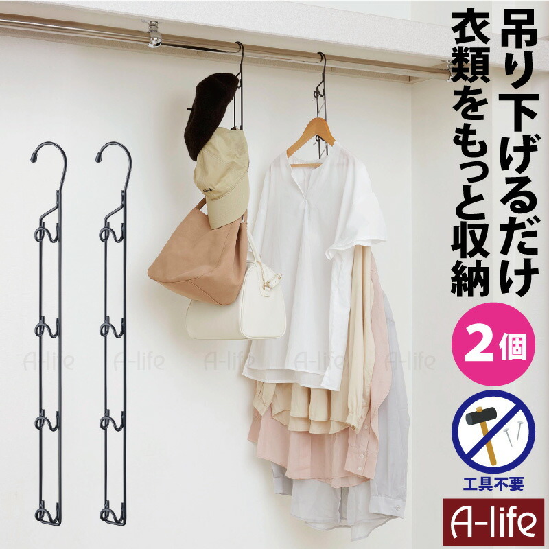 | 商品説明 | クローゼットのハンガーパイプに引っ掛けるだけ! 省スペースハンガー2個。 クローゼットのハンガーに掛けている服を省スペースに収納します。 スペースを有効活用し、たっぷり収納。 1個に4着分のハンガーが掛けられます。 服だけではなく、帽子やかばんも掛けられるので、使うものも探しやすいです。 壁掛け収納にも使えて便利です。 組み立て不要! 引っ掛けるだけで、すぐに使えます。 |