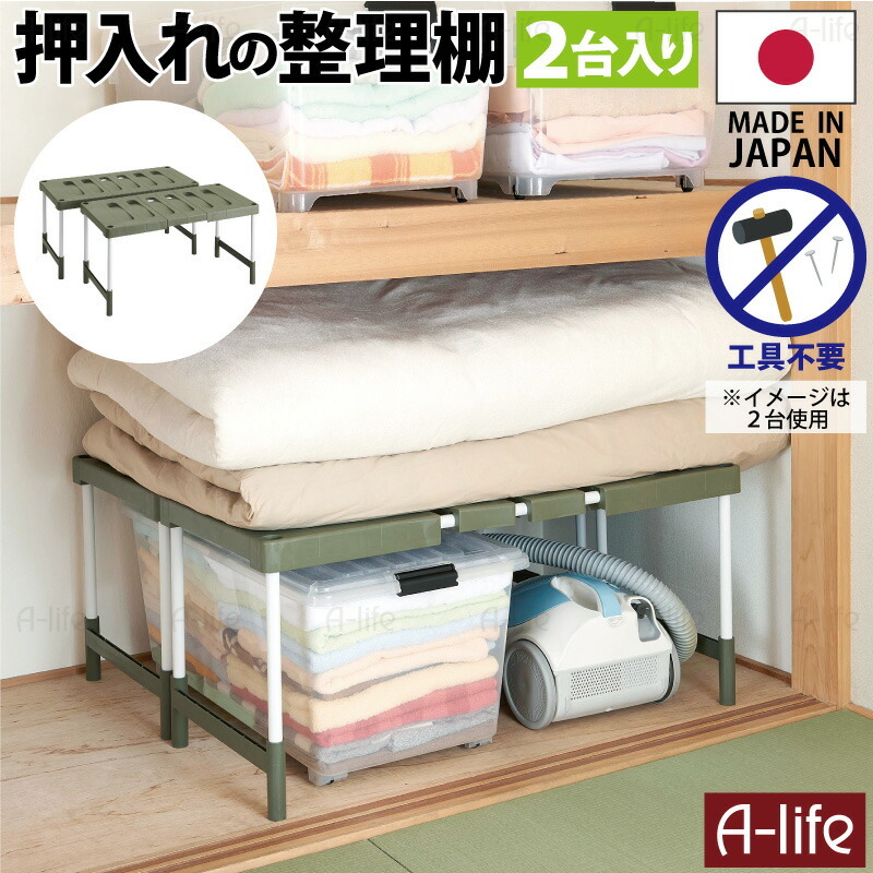 | 商品説明 | 押入れ収納 押入れの整理棚、ムダなくスッキリ収納。 幅が伸縮するので収納場所に合わせて設置できる整理棚 2個です。 幅76.5cm〜92cmに伸縮! 高さは35cm・40cmの2段階に調節できます。 押入れサイズにピッタリ! クローゼットにもOK! 棚板の穴に差し込んで2段に積み重ねて使用できるので、収納スペースを有効に利用! 収納空間が広がります。 ※従来品の買い替えや、従来品に積み重ねるためにご購入を検討されている方はご注意ください。 ・伸縮幅サイズが(旧) 76.5〜93.5cm → (新) 76.5〜92cmに変更となりました。 ・幅92cm以内であれば、従来品と積み重ねてご使用いただけます。 納戸の整理整頓にも便利です。 棚板はすのこ状になので通気性がよく、プラスチックなのでカビが生えにくく、お布団の収納にも便利です。 プラスチック製の棚板なので、お手入れもしやすいです。 棚板と補強脚のプラスチックは、環境に配慮し、食品などのパッケージを容器包装リサイクル法に基づいてリサイクルされた原料(容リ)を使用しています。 そのため斑点や色むらなどがありますが、性能にに問題はありません。また開封時に、においが気になる場合は、陰干ししてください。 工具不要 組み立て簡単。 【配送について】 詳しくは配送についてをご確認お願い致します。 詳細はこちら |