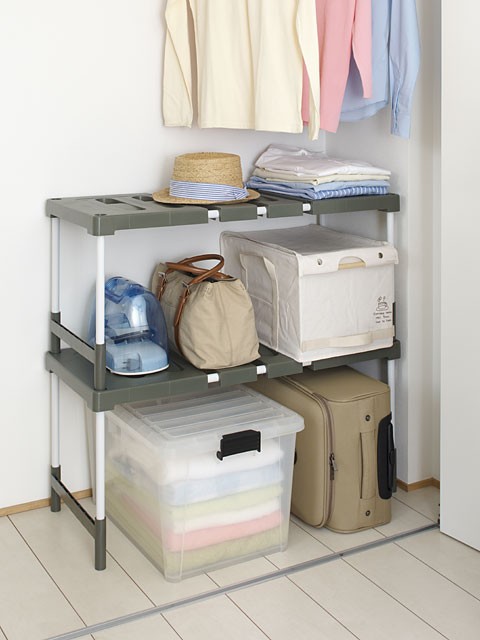 78〜92cmに横伸縮!高さは35・40センチ2段階に調整できますのでいろんな大きさの押入れサイズにもピッタリ!もちろんクローゼットにもOK!棚板の穴に差し込んで2段にして使用できるのでスペースを有効に利用!収納空間が広がります。