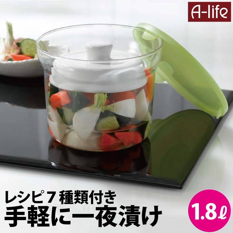 耐熱ガラス製容器 一夜漬け ポット 1.8リットル 重石 蓋付き 漬物 容器 梅干し 味噌 保存容器 つけもの容器 冷蔵庫 保存 電子レンジ 食洗器 食器洗い乾燥機 キッチン レシピ付き 北欧 台所 収納 流し下 シンク 流し台 新生活 清潔 a-life エーライフ