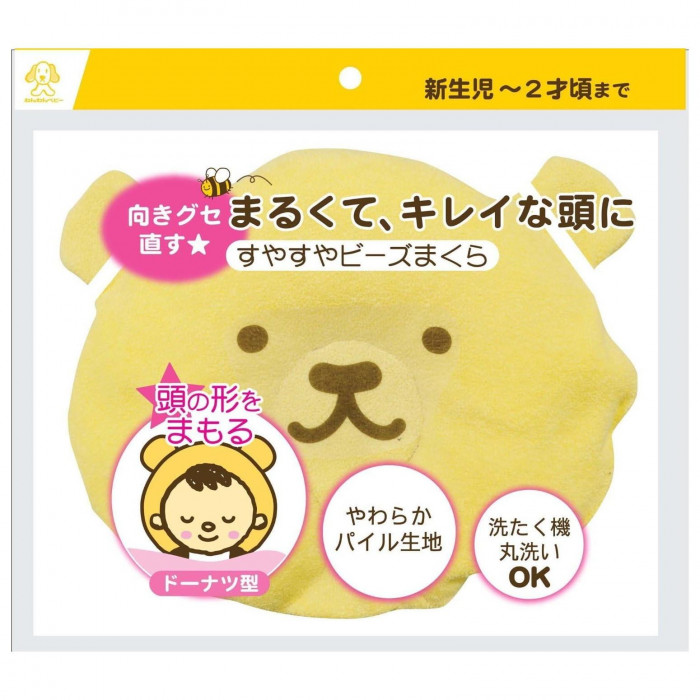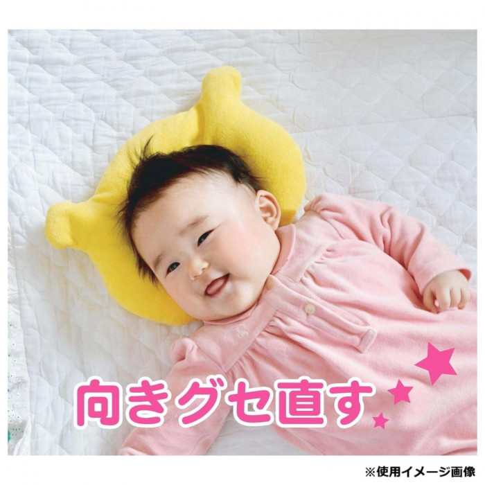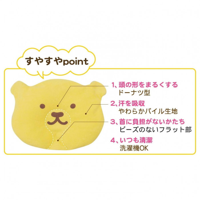 新生児の首に負担がないように、首の部分はビーズが入っていないフラットな形になっています。中のビーズを移動させる事で左右の高さが変えられます。片方ばかり向く赤ちゃんの向きグセを直します。