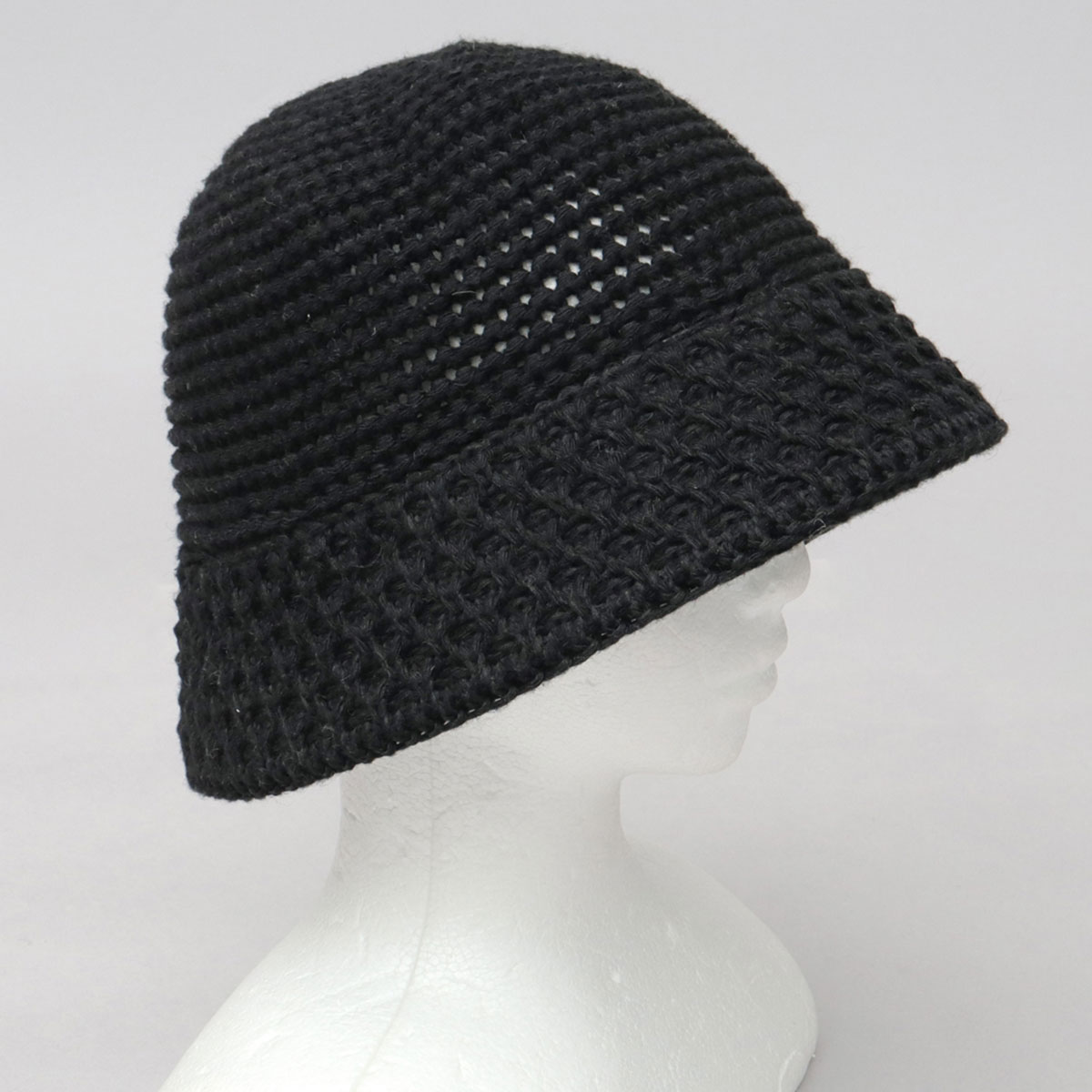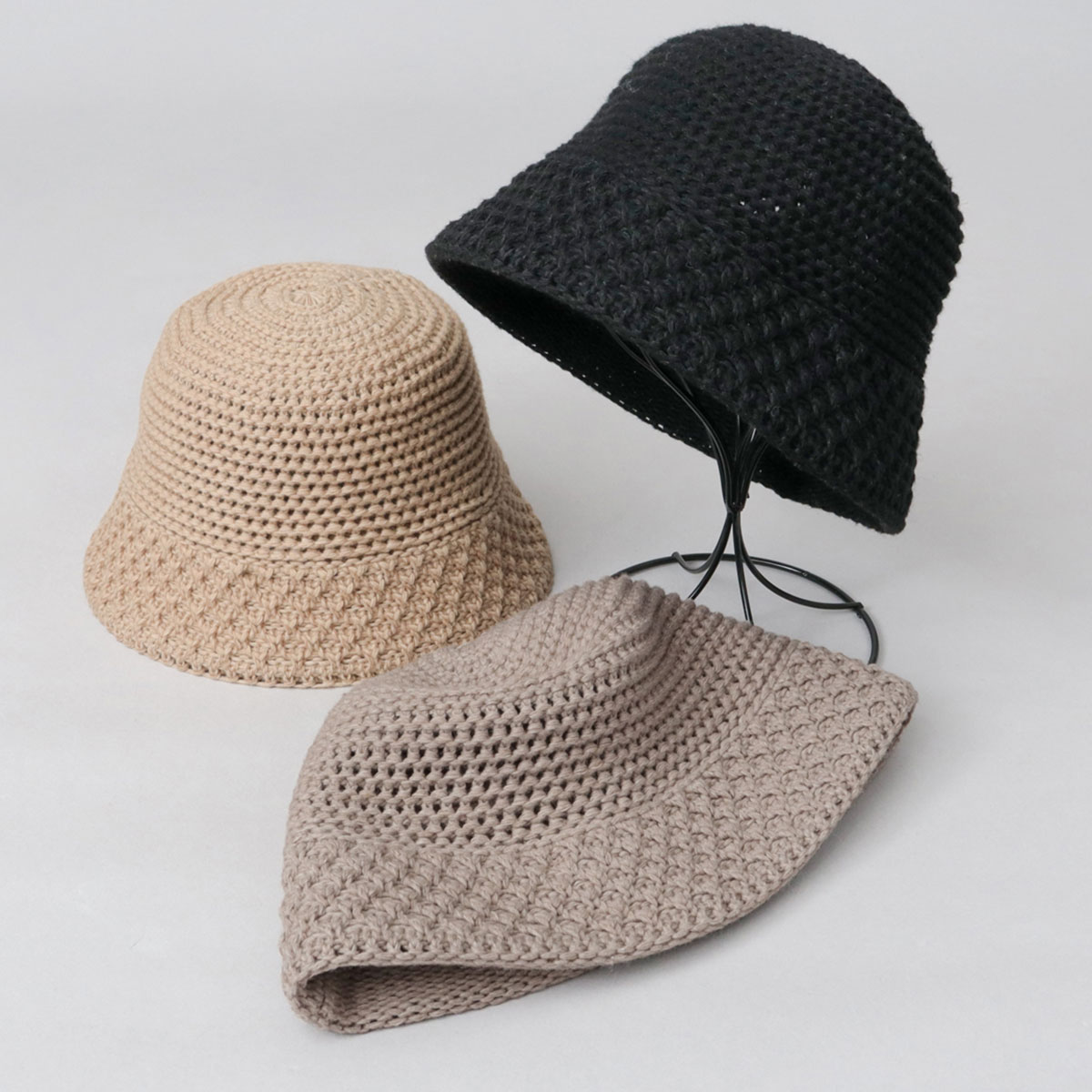 ◆切り替え編みニットハット◆やや透け感のある、ざっくりとしたこま編みが特徴のサーモニットハット。
