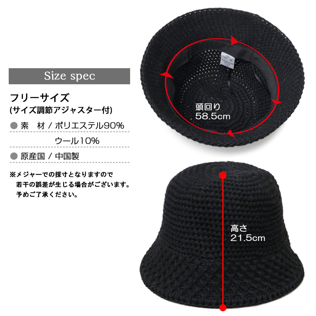 | サイズ | フリーサイズ (サイズ調節アジャスター付) 頭回り:58.5cm 高さ:21.5cm ※メジャーでの採寸となりますので若干の誤差が生じる場合がございます。予めご了承ください。 |