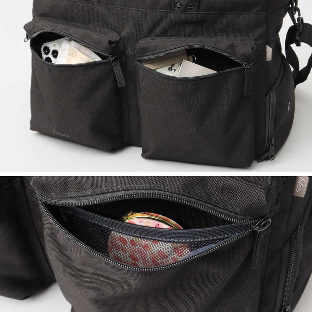 フロント部分には、立体感のあるファスナーポケット×2を配置。
