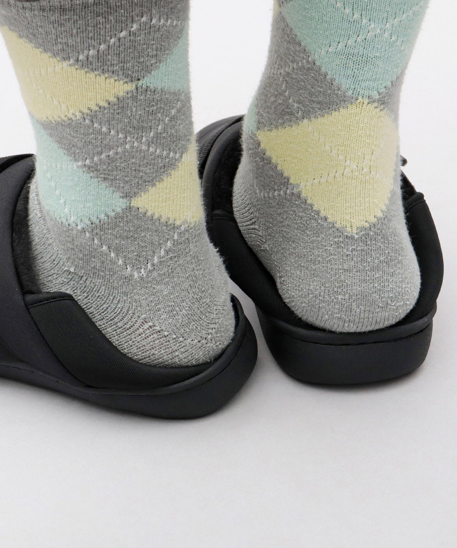 踵部分は柔らかな素材で、踏んでも着用できる、バブーシュ仕様。