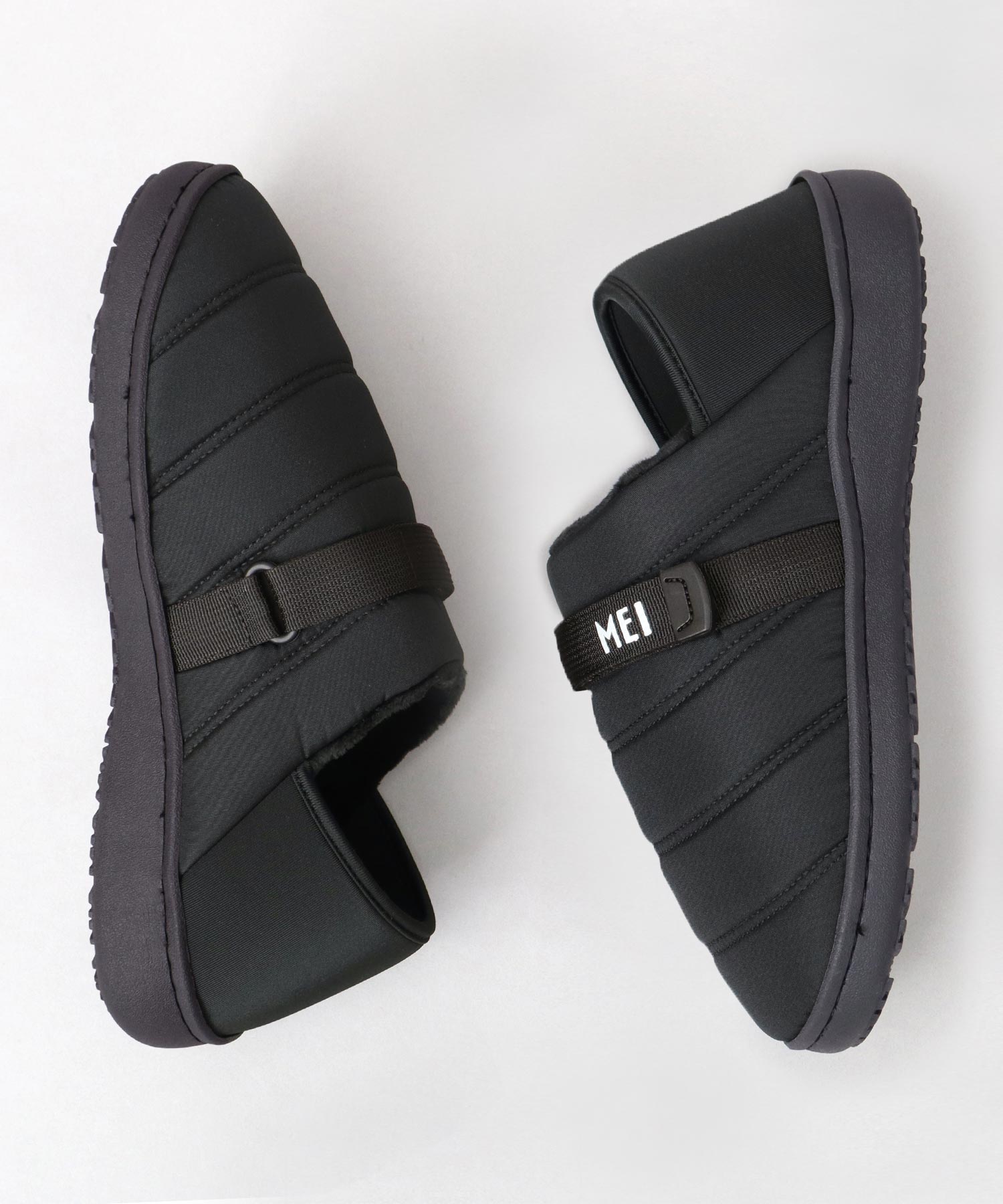 MEI定番のキルティングモックシューズに、フィット感の調節が可能なベルトが仕様追加された、ほどよくスポーティなデザイン。
