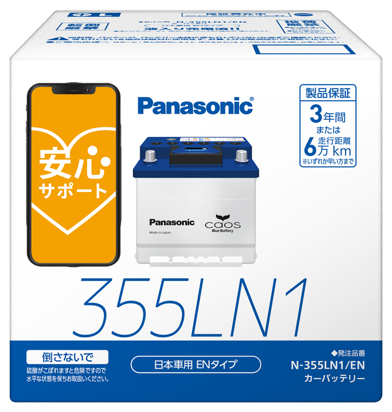 EN規格バッテリー搭載車用カーバッテリー『caos』シリーズ製品保証3年間または6万km ※いずれか早いほう