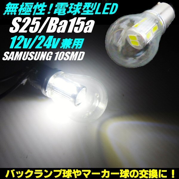 24V・12V兼用/Ba15s・S25/無極性サムスンチップ搭載・電球型白色SMDLED/トラックマーカーにも!