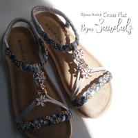 センターには花柄をかたどったおしゃれなビジューに、鮮やかな布に夏にピッタリの小さめのビジューを散りばめより一層華やかに且つ夏のビーチで履いていただきたい1足に仕上げました。