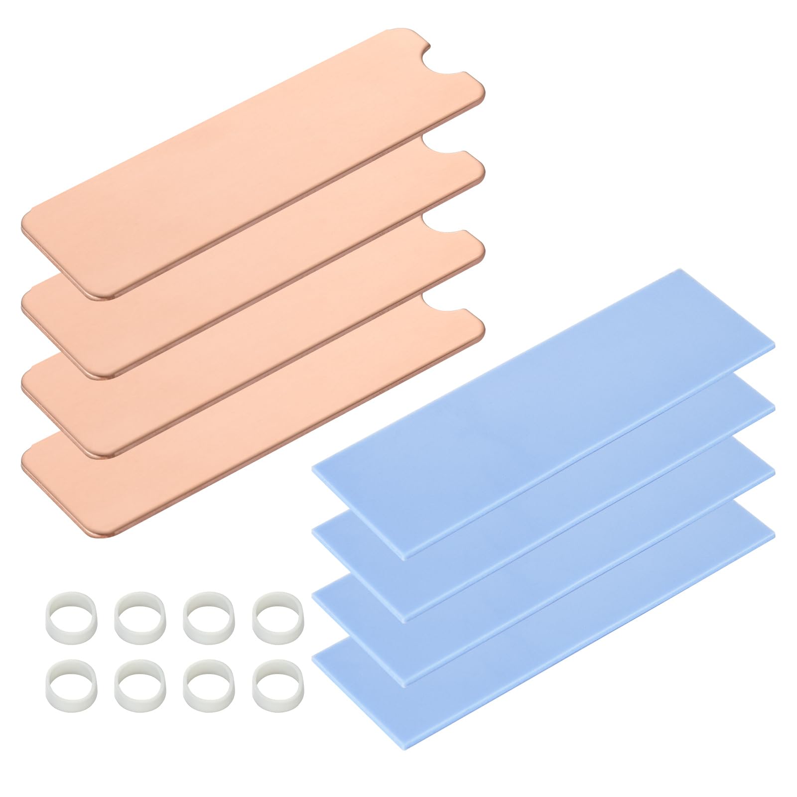 ・寸法&パッケージ内容寸法:ヒートシンク:73mm×21mm×1mm 導熱接着シート:73mm×21mm×0.5mm。パッケージ内容:銅製ヒートシンク×4枚、導熱接着シート×4枚、固定用シリコンゴムバンド×8個。