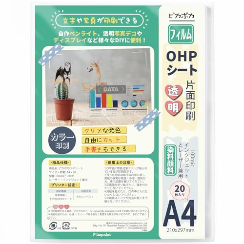 ・紙厚: 0.1mm。ピカポカohpフィルムは特に透明なプラスチック製で、見やすく柔軟性があります。表、文字や写真などをきれいに印刷して、フィルム上に高品質な印刷物を作成することができます