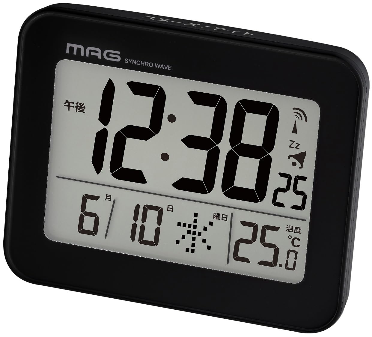 MAG(マグ) 目覚まし時計 置き時計 小型 小さい デジタル 電波時計 温度計 カレンダー 電子音 アラーム スヌーズ ライト ブラック ファ