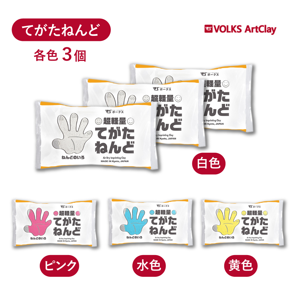 超軽量 てがたねんど 白 水色 ピンク 黄色 90g×3個 ボークス アートクレイ Volks Artclay 粘土 やわらかい 各色 造形 子供 孫 思い出 記念 成長 赤ちゃん 手形