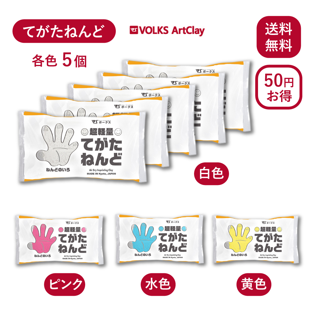超軽量 てがたねんど 白 水色 ピンク 黄色 90g×5個 ボークス アートクレイ Volks Artclay 粘土 やわらかい 各色 造形 子供 孫 思い出 記念 成長 赤ちゃん 手形