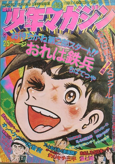 裏表紙少汚、ヤケ、昭和49年、講談社発行。<BR><BR>ちばてつや 「おれは鉄兵」<BR>政岡としや 「オッペケペーの音吉」<BR>矢口高雄 「釣りキチ三平」<BR>梶原一騎・ながやす巧 「愛と誠」<BR>永井豪 「イヤハヤ南友」 <BR>つのだじろう 「うしろの百太郎」<BR>赤塚不二夫 「天才バカボン」<BR>高森朝雄・中城健 「紅の挑戦者」<BR>ジョージ秋山 「ピンチー」<BR>梶原一騎・影丸譲也 「空手バカ一代」