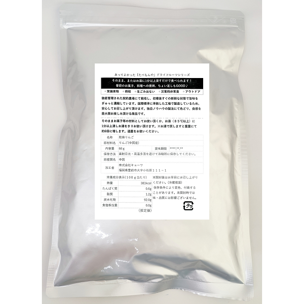 ●原材料名:りんご(中国産)●主要原料原産地:中国 乾燥地:中国 ●検査・袋詰め:福岡県 ●残賞味期限6ヶ月以上にて納品致します。