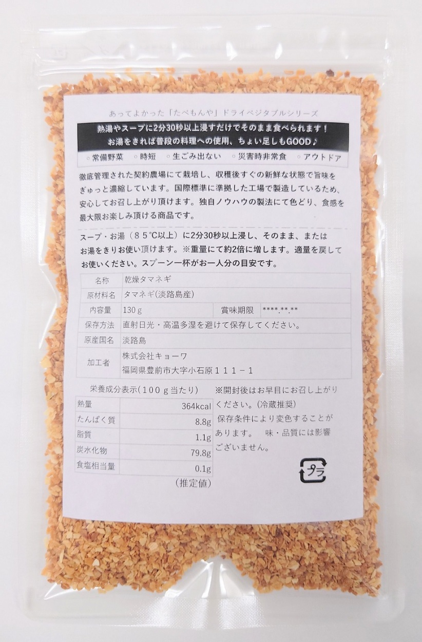 ●原材料名:タマネギ(淡路島産)●主要原料原産地:淡路島、検査・乾燥地:淡路島●袋詰め:福岡県●残賞味期限6ヶ月以上●内容量:130g