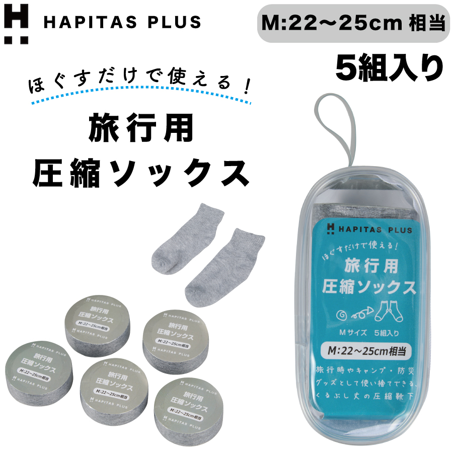 圧縮ソックス Mサイズ 22〜25cm相当 5組入り 旅行用 防災用 グレー くるぶし丈 レディース 旅行グッズ 防災グッズ トラベル ハピタスプラス シフレ 7138-M