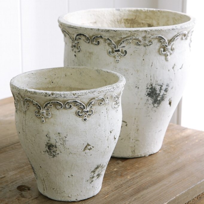 ホワイトを基調として、使い込まれたようなアンティーク加工が魅力的な植木鉢大小2個セットです。表面の柄がとても柔らかい印象で、まさに癒しの空間にピッタリ!おしゃれなフレンチカントリーデザインとシャビーで素朴な質感が、グリーンともよくマッチします。開口部は円形、使いやすい定番の円すい型スタンダード形状です。