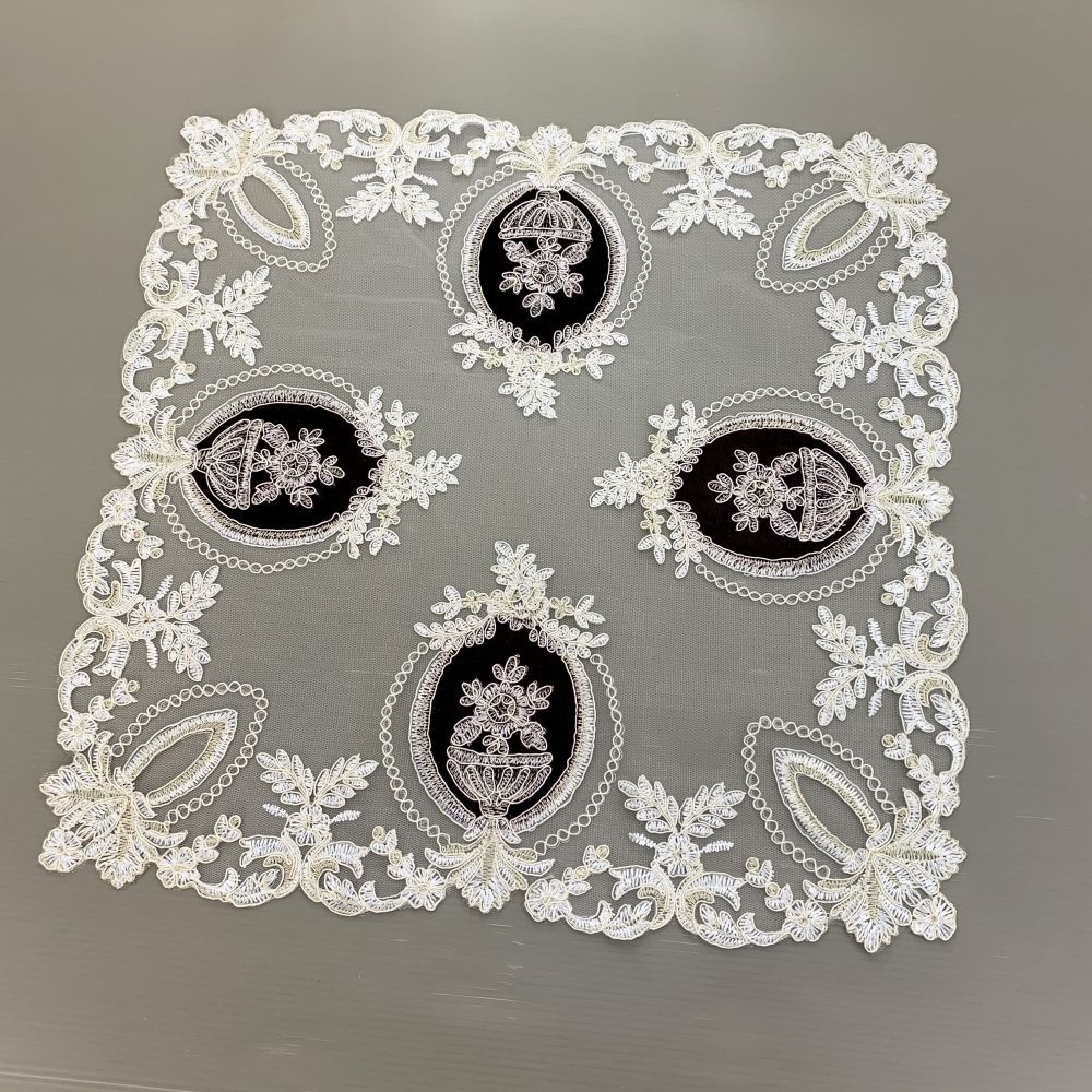 繊細なチュールレースにエンブレムの様なモチーフを合わせた豪華なデザインのレースのクロスです。