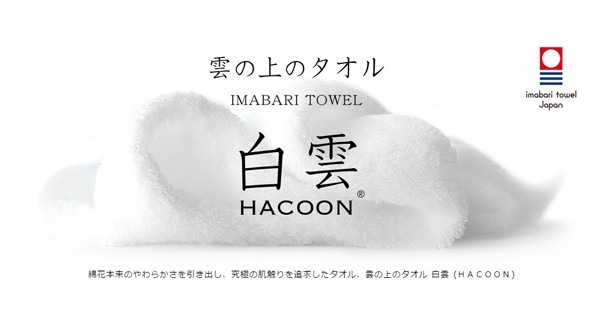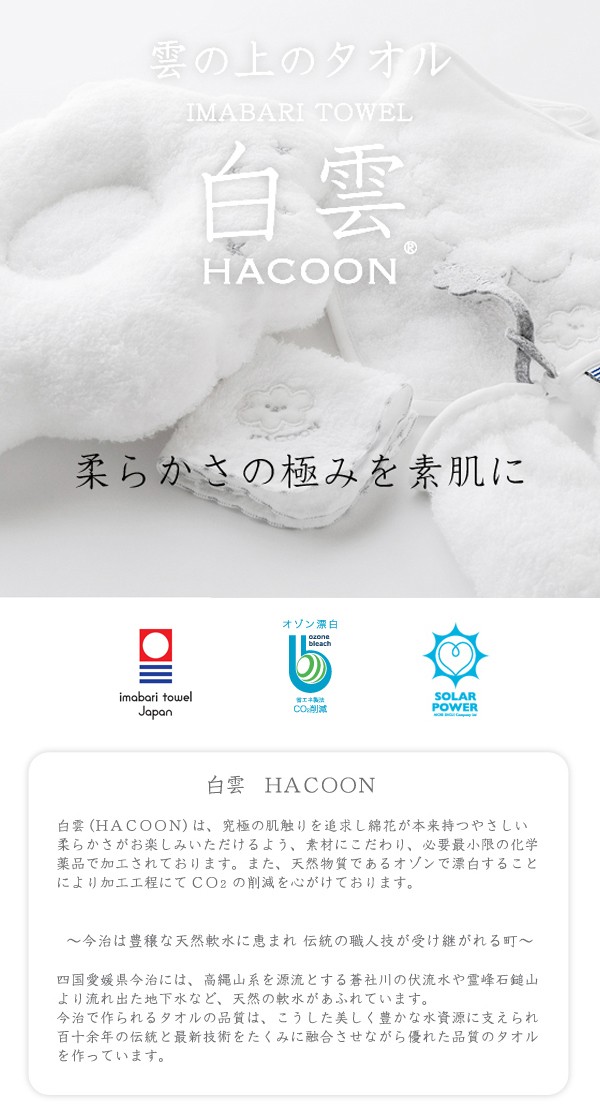 安心の日本製今治タオル!白雲 (HACOON) は、究極の肌触りを追求し綿花が本来持つやさしい柔らかさがお楽しみいただけるよう、素材にこだわり、必要最小限の化学薬品で加工されております。また、天然物質であるオゾンで漂白することにより加工工程にてCO2の削減を心がけております。