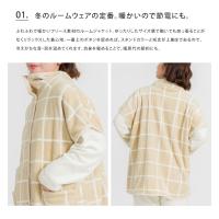 ゆったりしたサイズ感で動いても突っ張ることがなくリラックスした着心地。一番上のボタンを留めれば、スタンドカラーと裄丈が上腕まであるので、冷えがちな首・肩を温めてくれます。自身を暖めることで、暖房代の節約にも。軽くて程よいボリュームのフリース素材は、モコモコしすぎず重みや動きづらさを感じにくいので、冬場に凝りがちな首や肩の負担を軽減してくれます。半袖・お尻が隠れるぐらいの丈と、ゆとりのある身幅は、家事の邪魔をすることなく寒い冬でもスムーズに動けます。左右のポケットは、手を一時的に温めたり、スマホなどを入れたりできて便利。