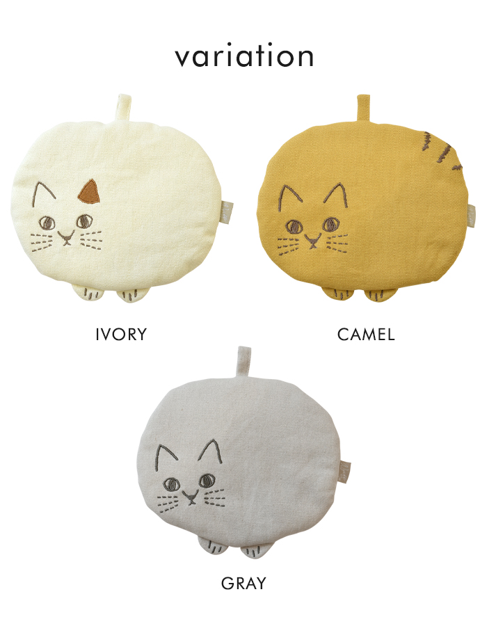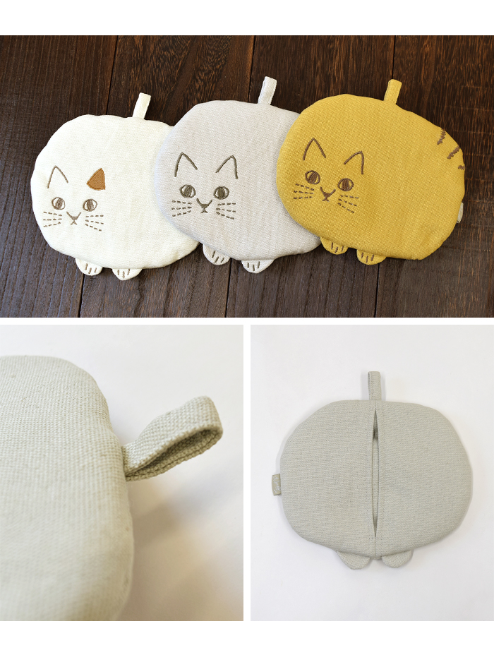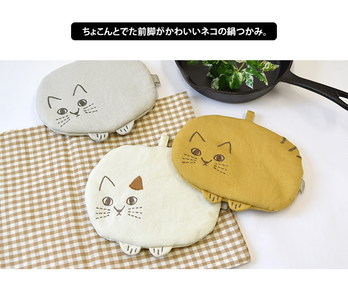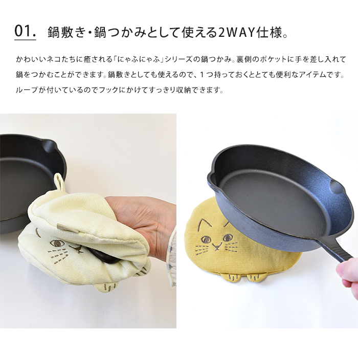 ちょこんとでた前脚がかわいいネコの鍋つかみ。かわいいネコたちに癒される「にゃふにゃふ」シリーズ。裏側のポケットに手を差し入れて鍋をつかむことができます。鍋敷きとしても使えるので、1つ持っておくととても便利なアイテム。ループが付いているのでフックにかけてすっきり収納できます。