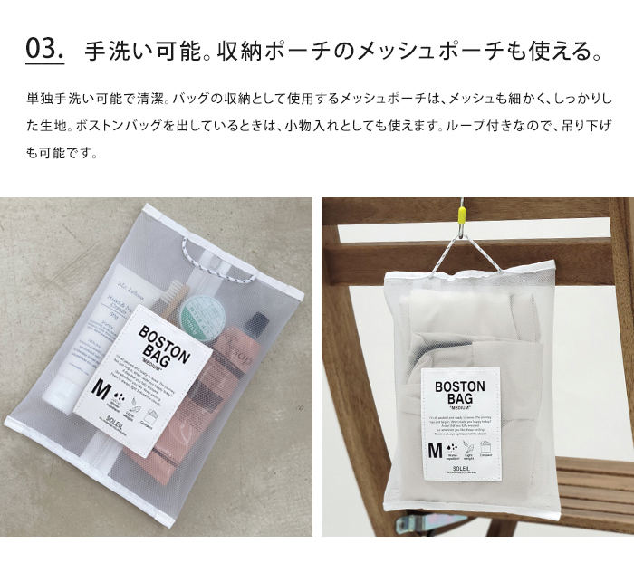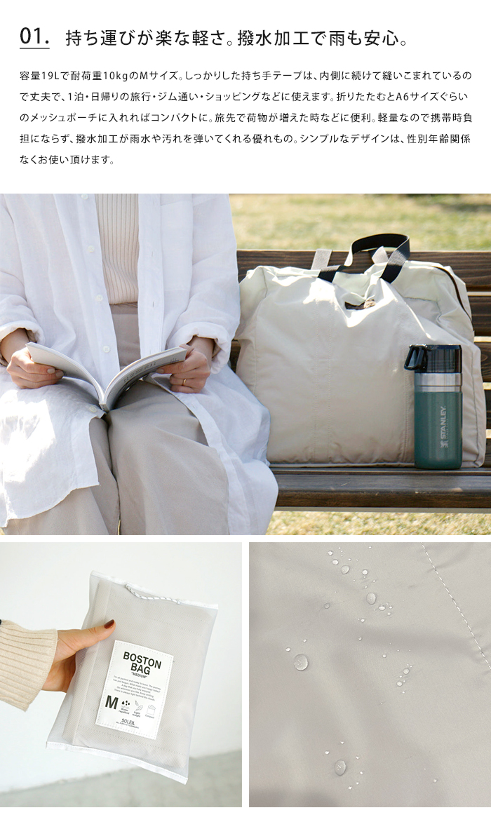 容量19Lで耐荷重10kgのMサイズ。1泊・日帰りの旅行・ジム通い・ショッピングなどに使えます。折りたたむとA6サイズぐらいのメッシュポーチに入れればコンパクトに。旅先で荷物が増えた時などに便利。軽量なので携帯時負担にならず、撥水加工が雨水や汚れを弾いてくれる優れもの。シンプルなデザインは、性別年齢関係なくお使い頂けます。内側に6つのポケットで、荷物の整理がしやすい仕様。バッグ口は大きく開くダブルファスナー。がばっと開いて荷物の出し入れに手間取りません。単独手洗い可能で清潔。バッグの収納として使用するメッシュポーチは、ボストンバッグを出して、小物入れとしても使えます。ループ付きで吊り下げも可能。