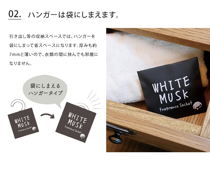 透明の外袋パッケージから取り出し、内袋の封は開けずにそのまま、お部屋・オフィス・玄関・クローゼット・トイレ・車内等、お好きなところでご使用可能。しっかり香る&嬉しい消臭成分入りで衣類の香り付けにもなり、おすすめです。置いていてもインテリアに馴染みやすいシンプルなデザイン。引き出し等の収納スペースでは、ハンガーを袋にしまって省スペースになります。厚みも約7mmと薄いので、衣類の間に挟んでも邪魔になりません。