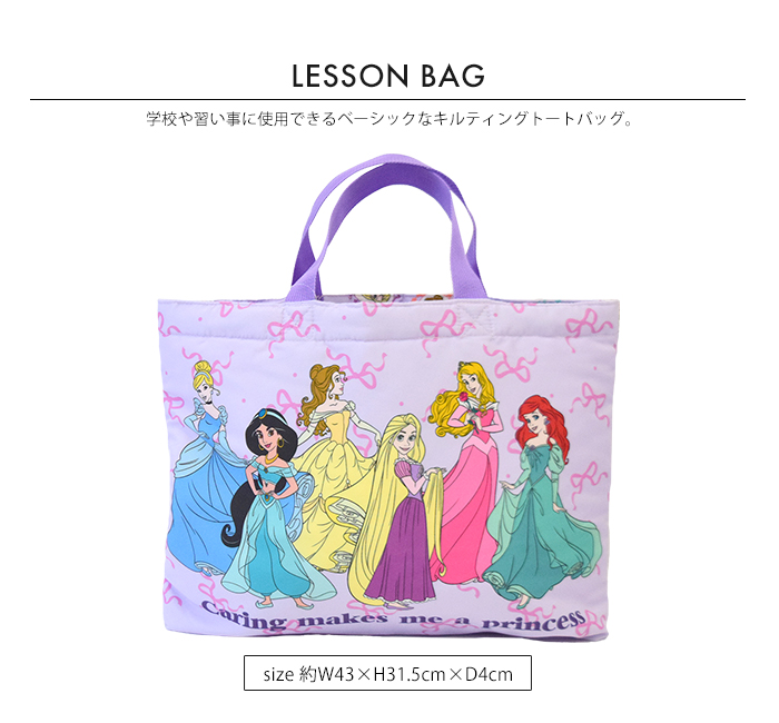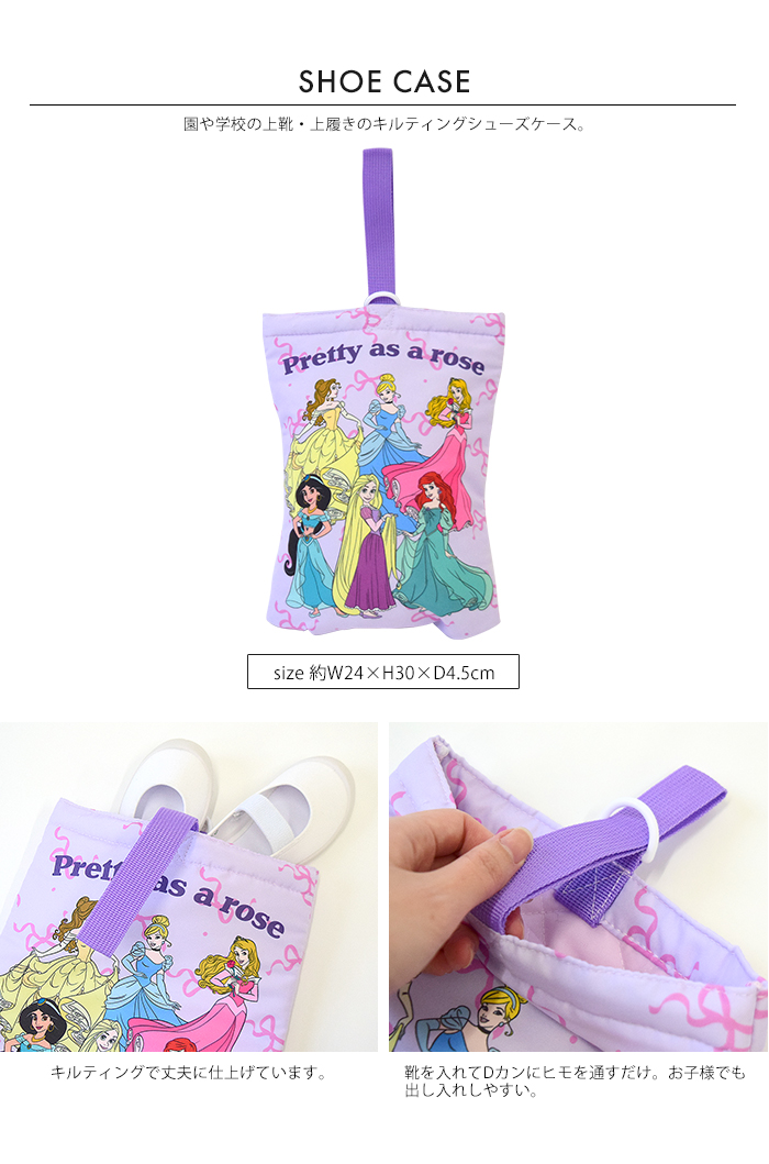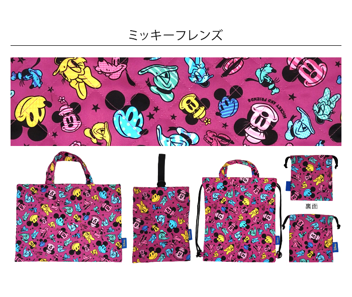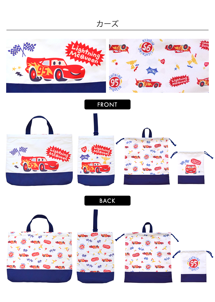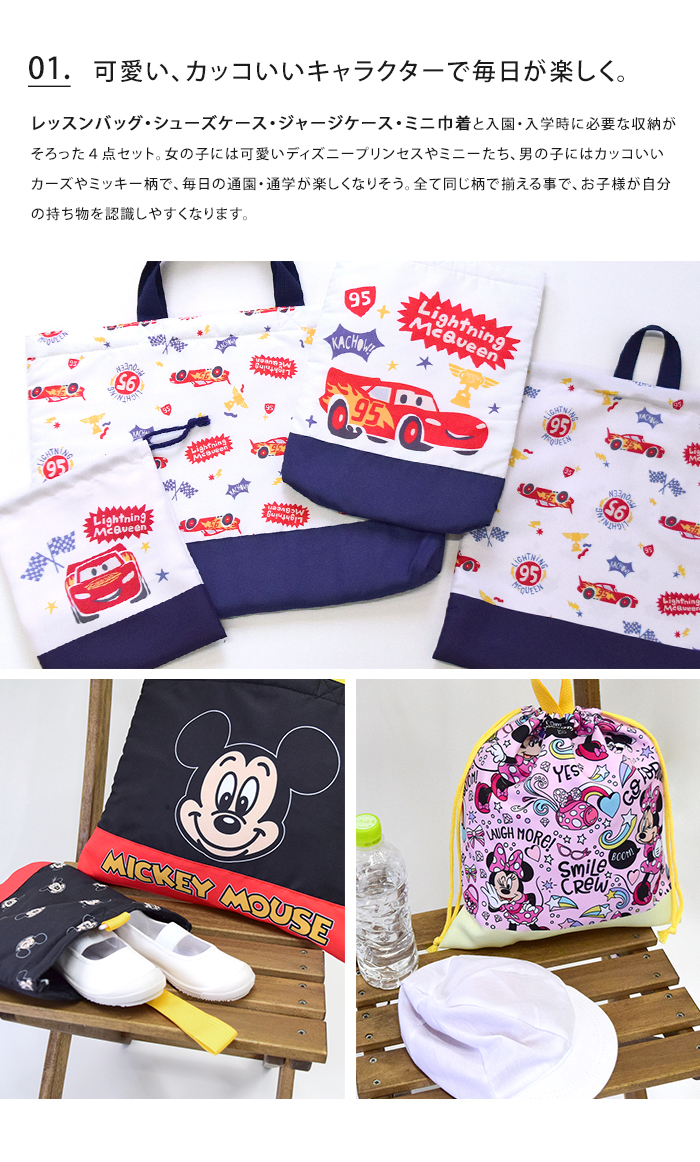 学校や習い事に使用できるベーシックなキルティングトートバッグ。園や学校の上靴・上履きのキルティングシューズケース。開閉しやすい巾着のジャージケースは、お着換えや体操服などを入れやすいサイズ。小物やコップの収納可能なミニ巾着。入園・入学時に必要な収納バッグがそろった4点セット。女の子には可愛いディズニープリンセスやミニーたち、男の子にはカッコいいカーズーやミッキー柄で、毎日の通園・通学が楽しくなりそう。全て同じ柄で揃える事で、お子様が自分の持ち物を認識しやすくなります。