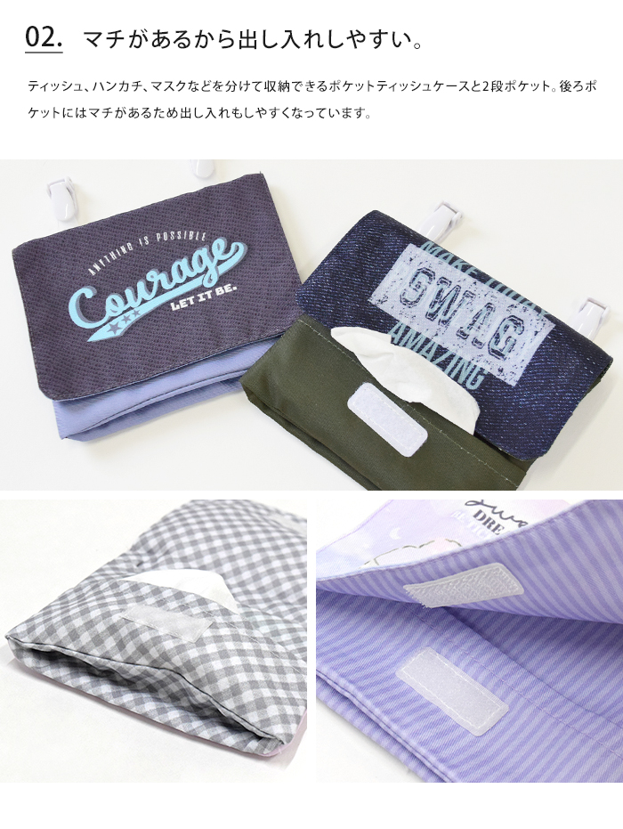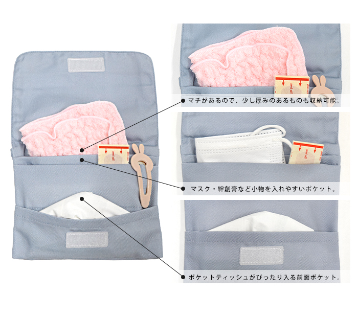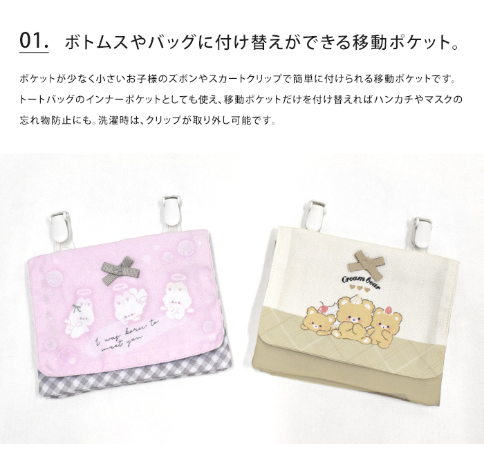 ポケットが少なく小さいお子様のズボンやスカートクリップで簡単に付けられる移動ポケットです。トートバッグのインナーポケットとしても使え、移動ポケットだけを付け替えればハンカチやマスクの忘れ物防止にも。洗濯時は、クリップが取り外し可能です。ティッシュ、ハンカチ、マスクなどを分けて収納できるポケットティッシュケースと2段ポケット。後ろポケットにはマチがあるため出し入れもしやすくなっています。