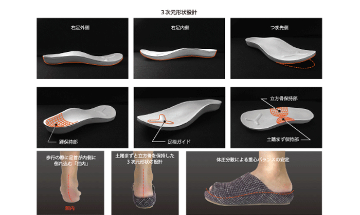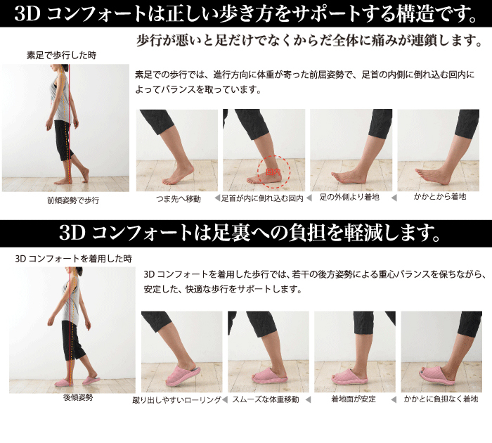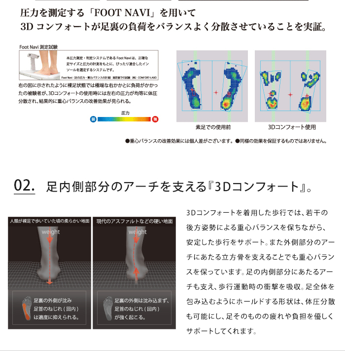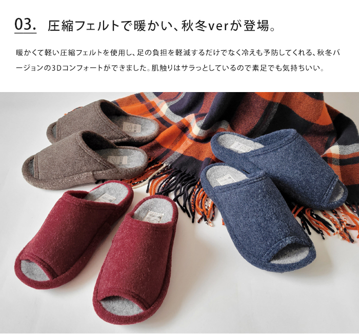 暖かく軽い圧縮フェルトを使用した秋冬バージョンの3Dコンフォートができました。サラっとしているので素足でも。中敷きの3Dソールが適度な硬さと弾力性のある素材なので気持ちよく、ぴったり足裏に馴染みます。着用した歩行では、若干の後方姿勢による重心バランスを保ちながら、安定した歩行をサポート。また外側部分のアーチにあたる立方骨を支えることでも重心バランスを保っています。足の内側部分にあたるアーチも支え、歩行運動時の衝撃を吸収。足全体を包み込むようにホールドする形状は、体圧分散も可能にし、足そのものの疲れや負担を優しくサポートしてくれます。