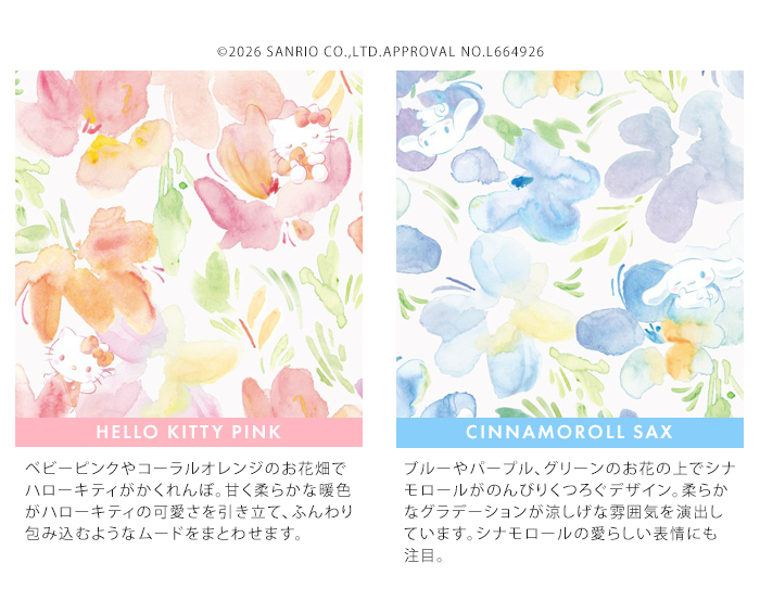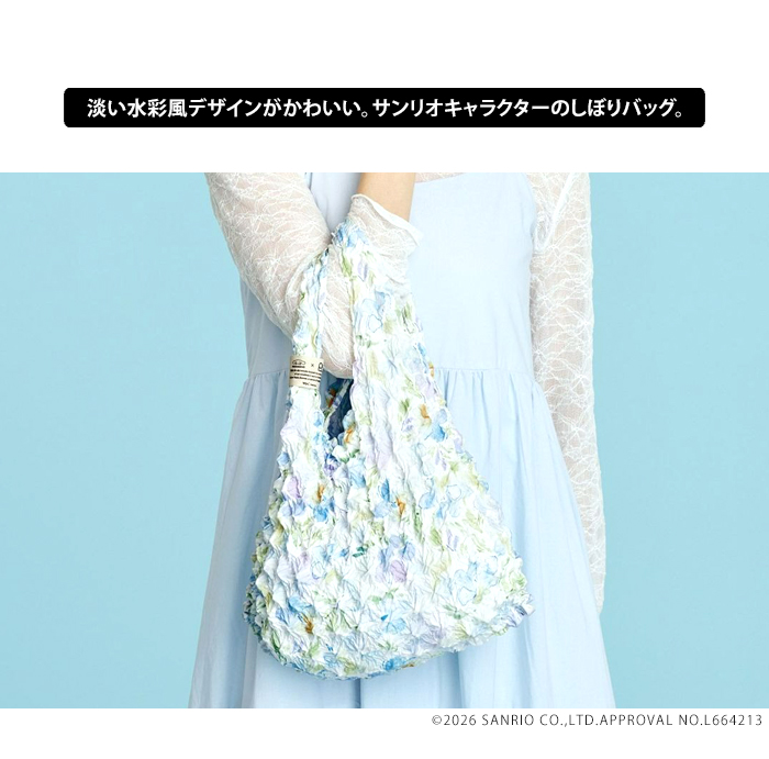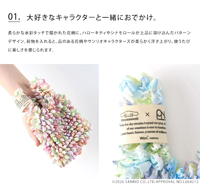 柔らかな水彩タッチで描かれた花柄に、ハローキティやシナモロールが上品に溶け込んだパターンデザイン。荷物を入れると、品のある花柄やサンリオキャラクターズが柔らかく浮き上がり、使うたびに楽しさを感じられます。入れたものに合わせて形が変わりマチを気にせず使えるので、底の広いお弁当などもぴったり入れられ、A4サイズも収容可能。小さなバッグにも収納しやすく持ち運びもらくらく。