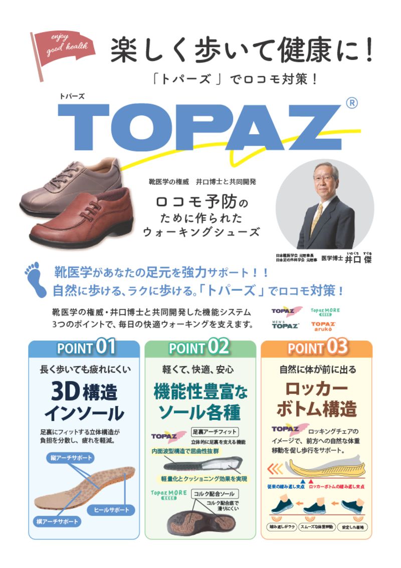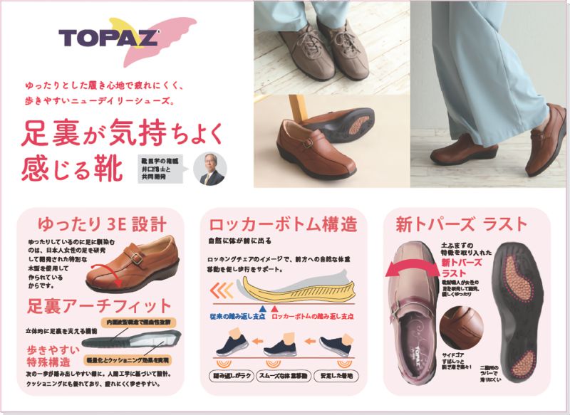 ゆったりとしたラストや滑りにくい靴底など、快適で歩きやすい機能がたくさん詰まった「トパーズ」のウォーキングシューズです。