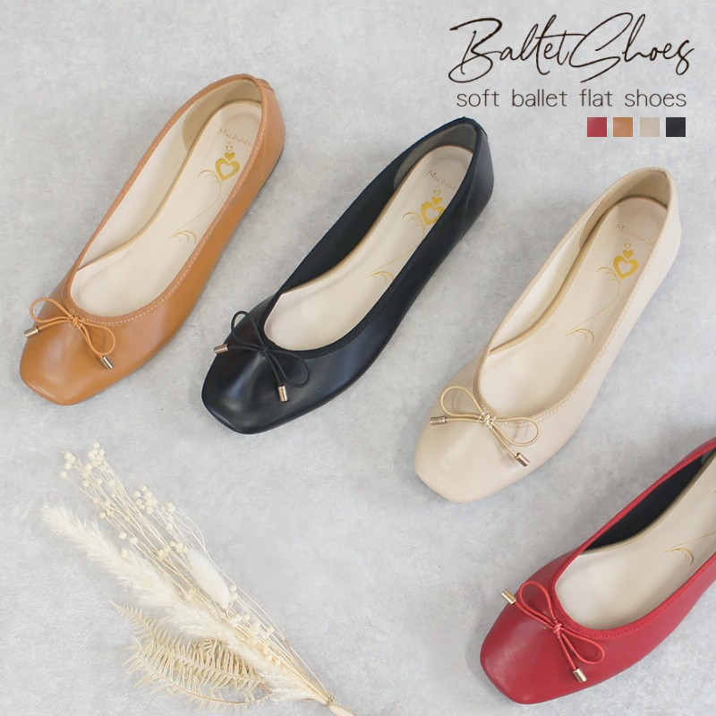 バレエシューズ ローヒール ぺたんこ パンプス 靴 リボン スクエア トゥ 低反発 ストレッチ カジュアルシューズ 黒 赤 おしゃれ 人気 春 sm2280