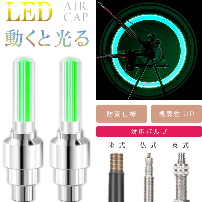 自転車タイヤバルブキャップ LEDライト グリーン 2本入 動くと光るエアキャップ 英式 仏式 米式 対応 視認性UPで夜間安全 as20022