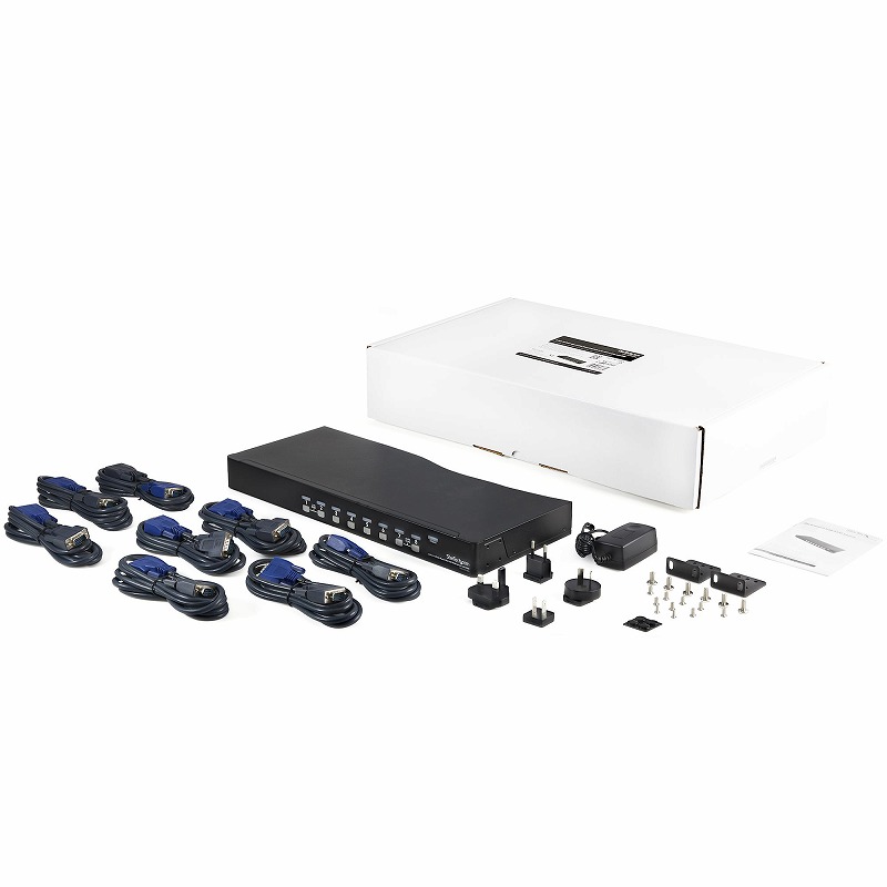 8台のサーバ/PCに接続するためのケーブルとアクセサリをすべて同梱しており、セットアップが簡単ですぐに導入できる便利なKVMスイッチキットです。