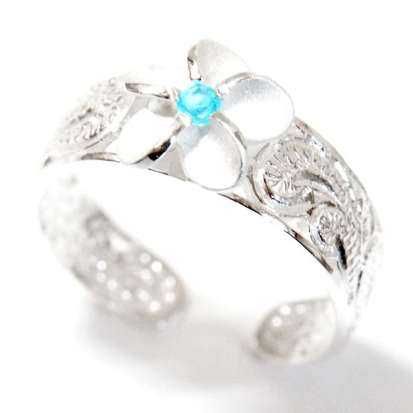 ハワイアンジュエリー トゥーリング プルメリア 花 ライトブルージルコニア カレイキニ 波 透かし彫り レディース シルバー925