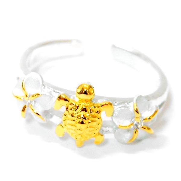 ハワイアンジュエリー トゥーリング ホヌ ウミガメ 2プルメリア 花 クリアジルコニア イエローゴールド ペアカラー レディース シルバー925
