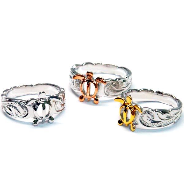 ハワイアンジュエリー リング ホヌ ウミガメ スクロール 波 レディース シルバー925 「イエローゴールド/シルバー/ピンクゴールド」