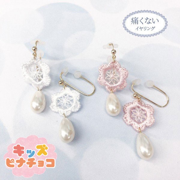 痛くないイヤリング しずくパール×小花レース キッズピナチョコ pr