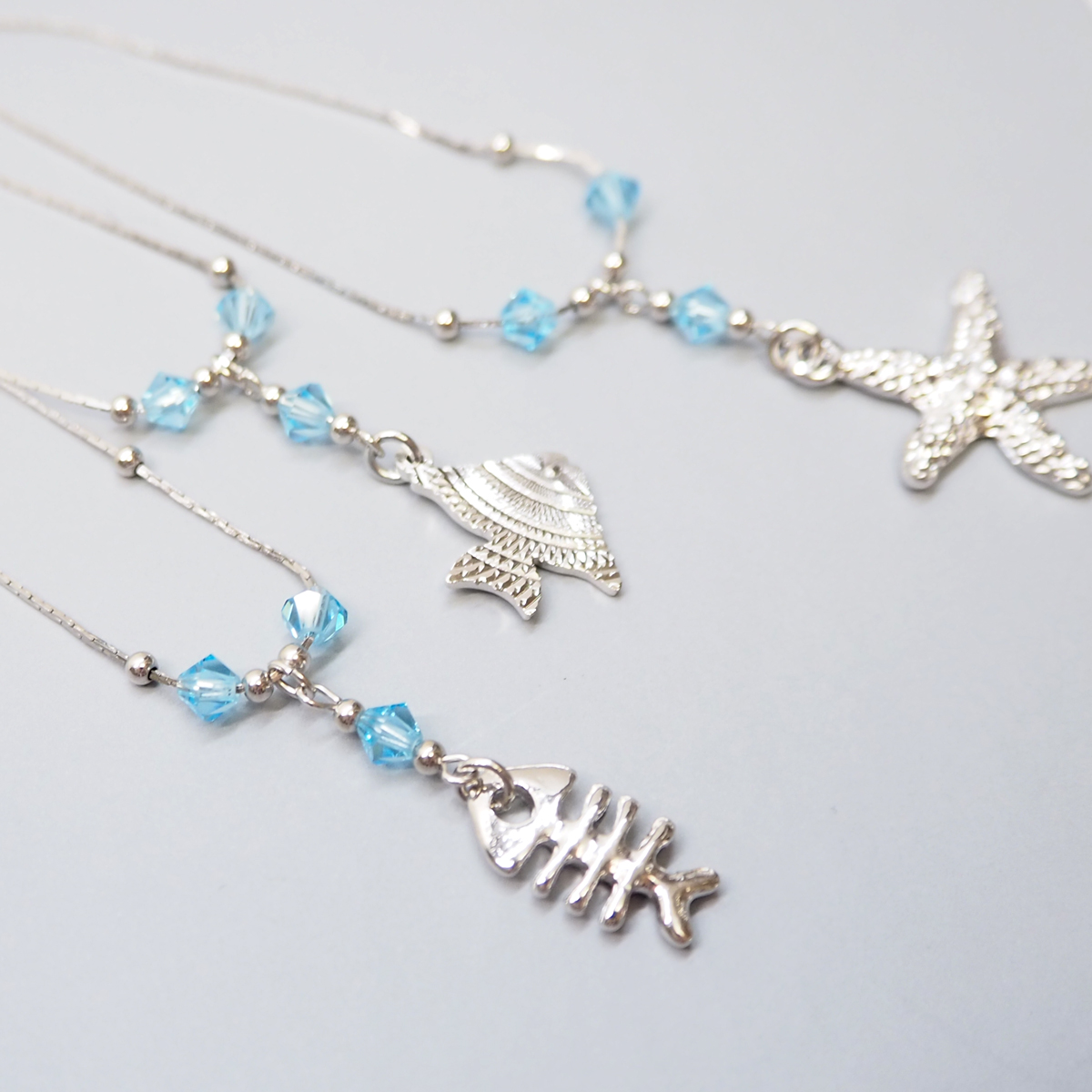 涼し気な青いビーズとシルバー色で統一された組み合わせがお洒落ポイント。細いチェーンが上品です。