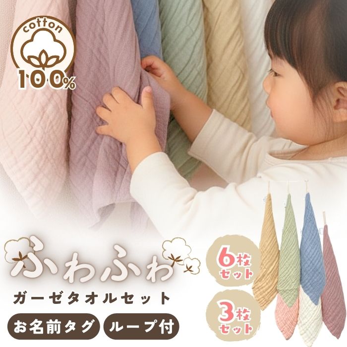 ループ付きタオル お名前タグつき 3枚 6枚セット 綿100% モスリンコットン ガーゼ ふわふわ ハンドタオル 保育園 幼稚園 入園準備 手拭き キッチン 爆買