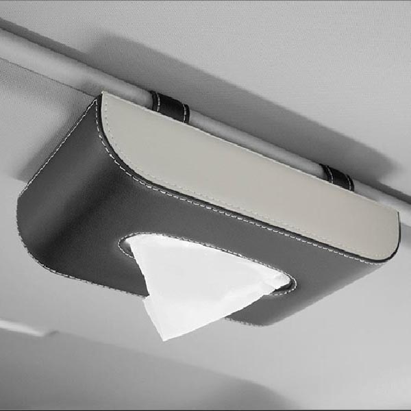 運転席や助手席のサンバイザーに装着するタイプのティッシュケースです。サンバイザーに取り付けられるフック付きで、シンプルデザインなので、車内のインテリアを損なわず、デッドスペースを有効活用できる機能的なティッシュホルダーです。目線よりも上に位置する置き場所なので、視界を邪魔しない、ドライブ中でも気になりません。